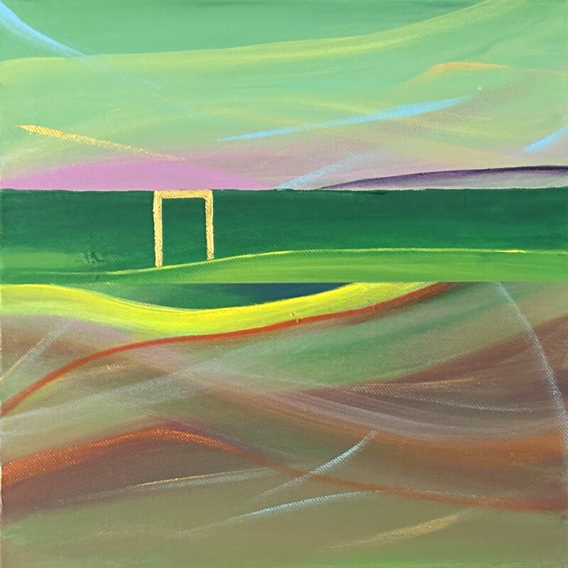It invites the observer to reflect on a moment of introspection and calm. The golden threshold, set in a softly colored landscape, represents a passage to a dimension of inner peace and contemplation, where silence becomes a guide and transformation. An artwork that combines mystery and serenity, perfect for those seeking profound inspiration.
