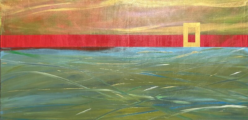 Un’opera che evoca il fluire della vita, con il movimento dell’acqua e la presenza di una porta che invita ad attraversare il confine tra realtà e immaginazione. Le tonalità fluide del blu e del verde, unite al contrasto della linea rossa, simboleggiano il viaggio verso l’ignoto e il coraggio di immergersi nel cambiamento. La porta al centro rappresenta una soglia, un passaggio verso nuove emozioni e scoperte.