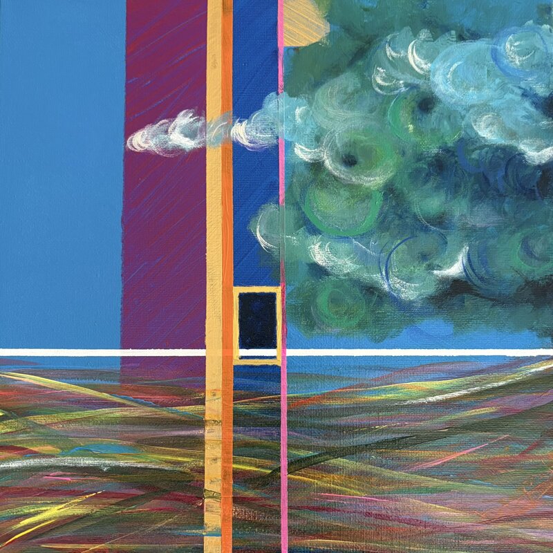 Linee verticali e orizzontali si intrecciano in uno spazio che sembra sospeso tra terra e infinito. La geometria rigorosa dialoga con il movimento fluido delle nuvole e dei campi, creando un equilibrio tra ordine e caos, struttura e natura. Al centro, una piccola apertura nera diventa simbolo di passaggio: una porta invisibile che invita a varcare la soglia, oltre il visibile, verso un altrove fatto di luce e mistero.Vertical and horizontal lines intertwine in a space that seems suspended between earth and infinity. Rigorous geometry dialogues with the fluid movement of clouds and fields, creating a balance between order and chaos, structure and nature. At the center, a small black opening becomes a symbol of passage: an invisible door inviting us to cross the threshold, beyond the visible, into an elsewhere made of light and mystery.