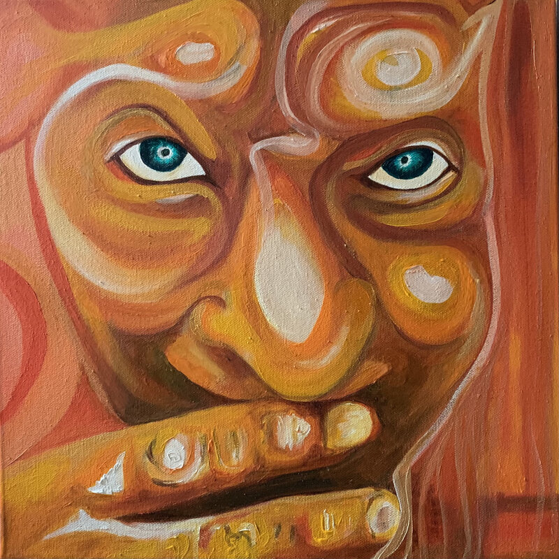 Volto intenso, scolpito da tonalità rosse e aranciate, emerge come fuoco vivo. Lo sguardo, tagliente e penetrante, sembra attraversare lo spettatore, portando con sé tutta l’energia del pianeta guerriero. Le dita sulle labbra evocano un gesto ambiguo: silenzio o sfida, introspezione o contenimento della forza che preme dall’interno. Nei vortici e nelle forme fluide che attraversano il viso si manifesta il conflitto interiore tra istinto e coscienza, guerra e trasformazione.