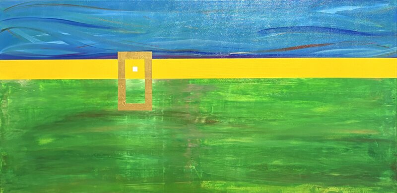 Quest'opera è un viaggio simbolico tra cielo, terra e anima. Il blu profondo del cielo si unisce al verde vibrante della terra, separati da una linea dorata, simbolo di equilibrio e illuminazione. Al centro, una porta minimalista invita a esplorare l'orizzonte interiore, oltre il visibile, verso un mondo di riflessione e trasformazione. Un'opera che parla di connessione, introspezione e possibilità infinite.